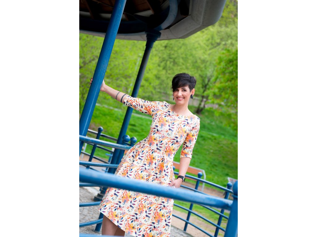 Šaty mají ¾ rukáv a skládanou sukni s velkými kapsami.