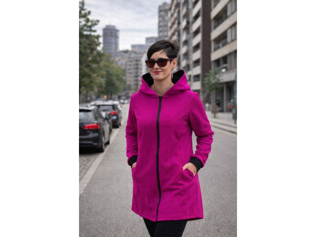 Má rovný zip, prošité kapsy, velkou kapuci.